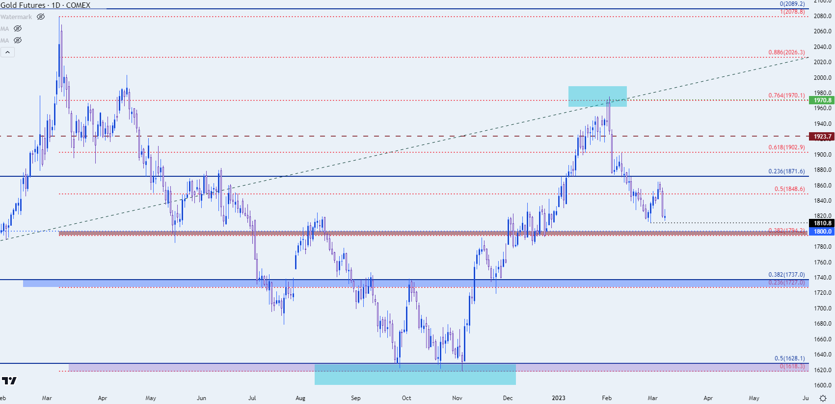 - 在撰写本文时,我们还处于周中,虽然看涨吞噬形态尚未被完全否定,但对多头来说并不乐观。跌破上周低点会使形成的形态失效,并为空头站台,市场将聚焦1800心理点位上,随后则是1795,该点位也是最近跌幅的38.2%斐波那契点位。