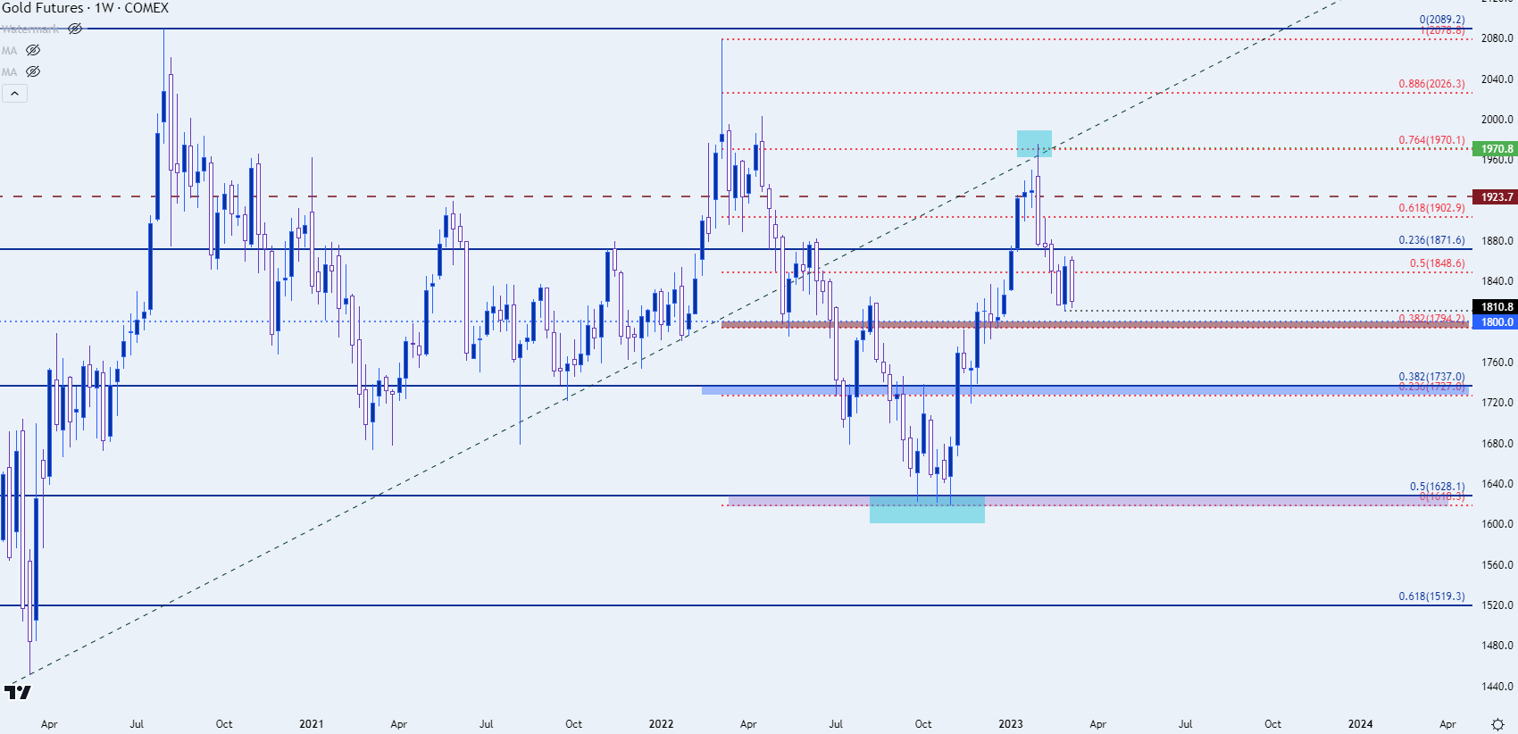 - 50%斐波那契点位落在1628,该点位在9月、10月和11月分别经受了三次考验。随着人们开始期待美联储可能会温柔对待市场,黄金多头重新入场,价格从11月低点上涨到2月高点,涨幅达22.05%。就在那时,76.4%斐波那契点位开始发挥作用,引发市场抛售并守住高点。