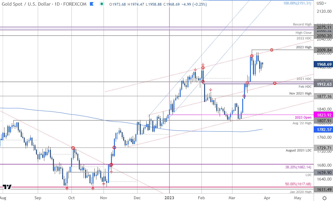 黄金价格从2022年11月的低点上涨了惊人的24%,仅在本月,黄金/美元就飙升了10%以上。上周反弹停滞在上升趋势阻力位,在更宏观的上升趋势范围内出现更大回调的风险仍然存在。以上是黄金/美元短期技术图表上重要的最新目标位和失效位。