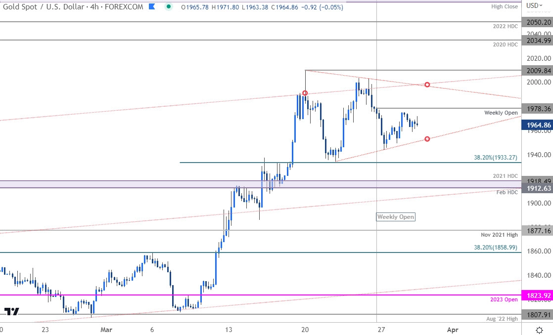 技术展望:在上个月的黄金短期价格展望中,我们注意到突破3月份开盘区间的黄金/美元正在接近初始阻力位,并且“最终需要上破/收盘高于2021年11月高点1877,才能推动下一轮涨势。3月13日,黄金突破了这一关口,涨势较月度低点超出11%以上。几天后,由于动能背离,涨幅在上升趋势阻力位面前步履为艰,现在价格在下方的盘整形态内等待指引和寻求突破。