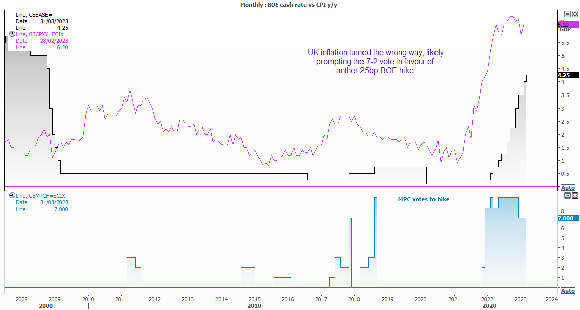 - 英国央行议息会议表决时,以7比2的结果赞成加息25个基点,在最新高通胀数据出炉后,将其利率提高到4.25%。货币市场正在消化最后一次加息25个基点的影响,但经济学家却预计下次央行会议将暂停加息。