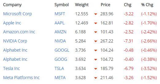 与其他指数相比,纳斯达克100指数非常依赖头部企业,其大部分权重股均来自七家“大型科技公司”。如下图所示,除了Alphabet(GOOG和GOOGL)之外,这些龙头的表现都落后于该指数今天-1.0%的走势: