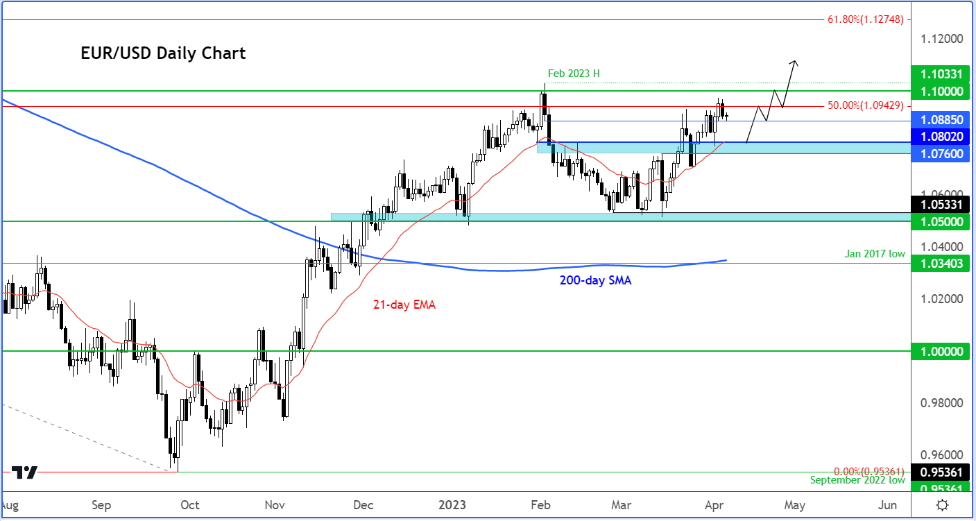 欧元/美元自3月初在1.05附近获得关键支撑以来,一直在创下更高的低点。单一货币的涨势又好又稳定,这对多头来说是幸福的烦恼,同时对空头来说则屡屡受困。由于价格保持在21日指数移动平均线上方和关键支撑位1.0800附近,阻力最小的方向仍然是上行,因此若即将公布的美国就业数据进一步助力的话,它仍有望攀升至2月高点1.1033上方。