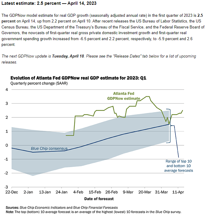 根据亚特兰大联储GDPNow模型,“4月14日对2023年第一季度实际GDP增长(经季节性调整后的年率)的估计为2.5%,高于4月10日的2.2%”,几乎没有证据表明经济衰退迫在眉睫可能会促使联邦公开市场委员会(FOMC)实施更高的利率,因为通胀仍远高于央行2%的目标。