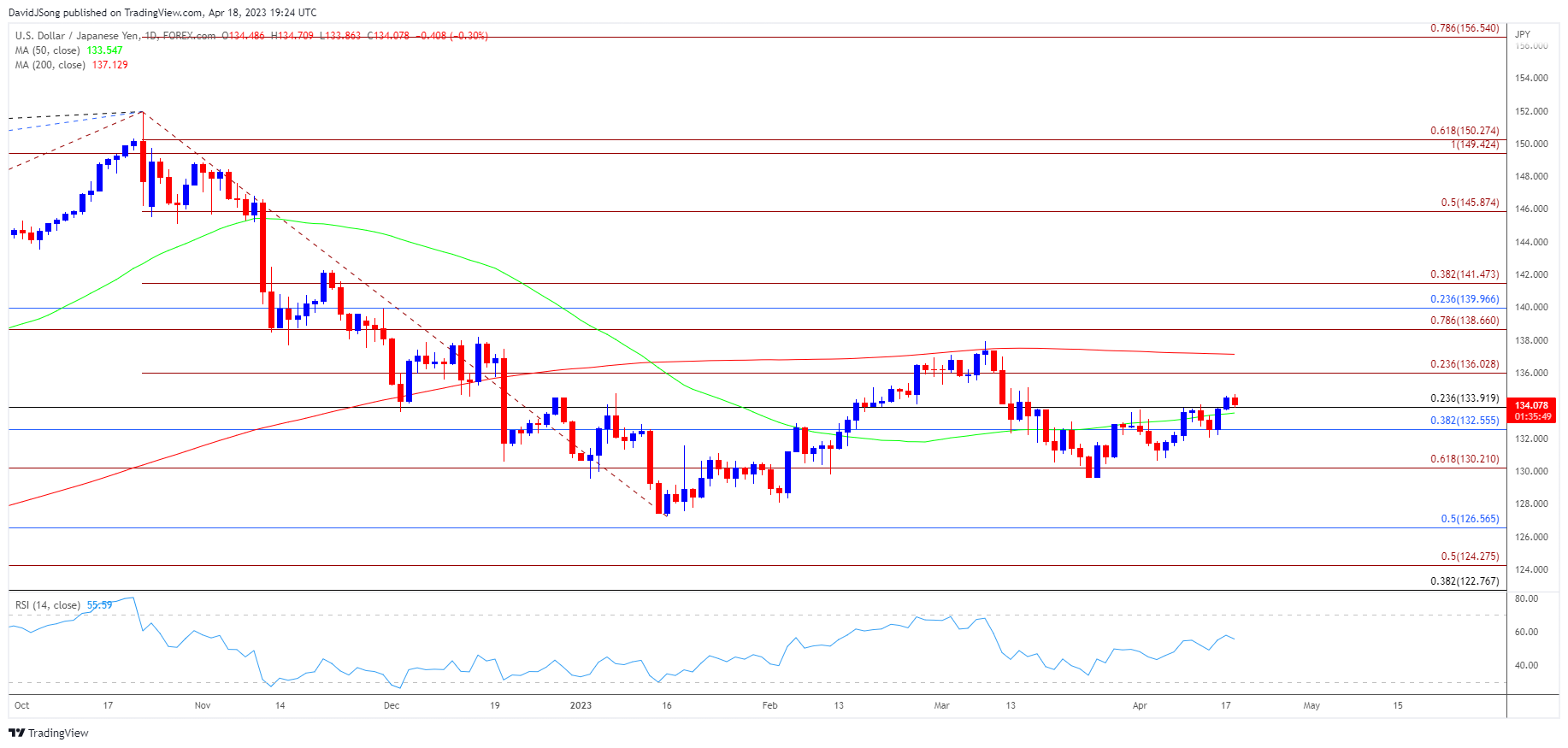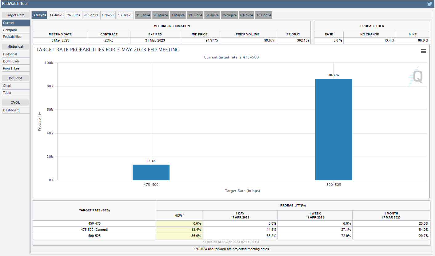 因此,围绕FOMC的猜测可能会继续影响美元/日元,因为CME FedWatch工具显示再次加息25个基点的可能性超过80%,主席杰罗姆·鲍威尔及其同僚是否会在5月3日的下一次利率决议中调整前瞻性指引还有待观察,因为“委员们在3月会议时的预测包括今年晚些时候开始的温和衰退以及在随后的两年里复苏。”