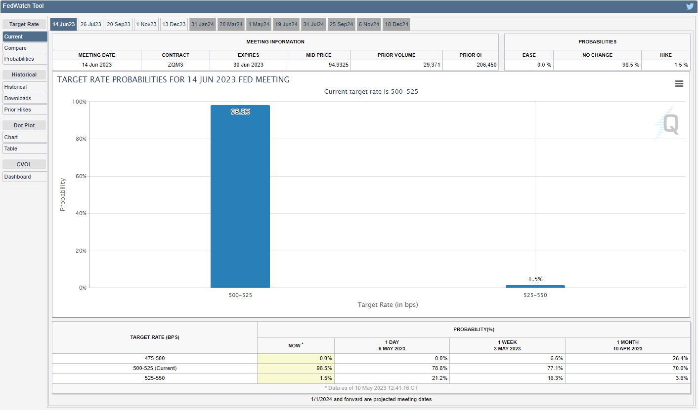 根据CME FedWatch Tool的数据,市场参与者预计联邦公开市场委员会(FOMC)将基准利率维持在当前5.00%至5.25%区间内的概率大于90%,随着美联储将要发布更新后的经济预测摘要(SEP),主席杰罗姆·鲍威尔及其同僚是否会在6月14日进一步调整前瞻性指引还有待观察。