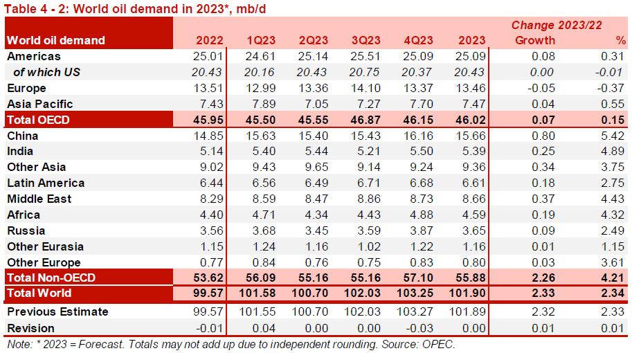 这些动向可能会抑制近期油价下跌,因为这意味着全球增长前景有所改善,石油输出国组织(欧佩克)是否会在未来几个月调整生产计划还有待观察,因为最新的月度石油市场报告(MOMR)显示,“到2023年,对世界石油需求增长的预测大致保持不变,为2.3百万桶/日。