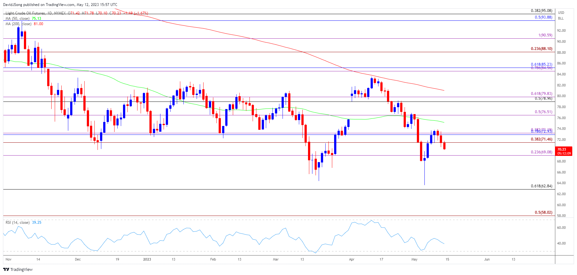 - 最近一系列更低的高点和低点可能会将油价打压至69.10美元(23.6%斐波那契延伸位),跌破年线低点(63.64美元)后,62.80美元(61.8%斐波那契回撤位)将重新受到关注。