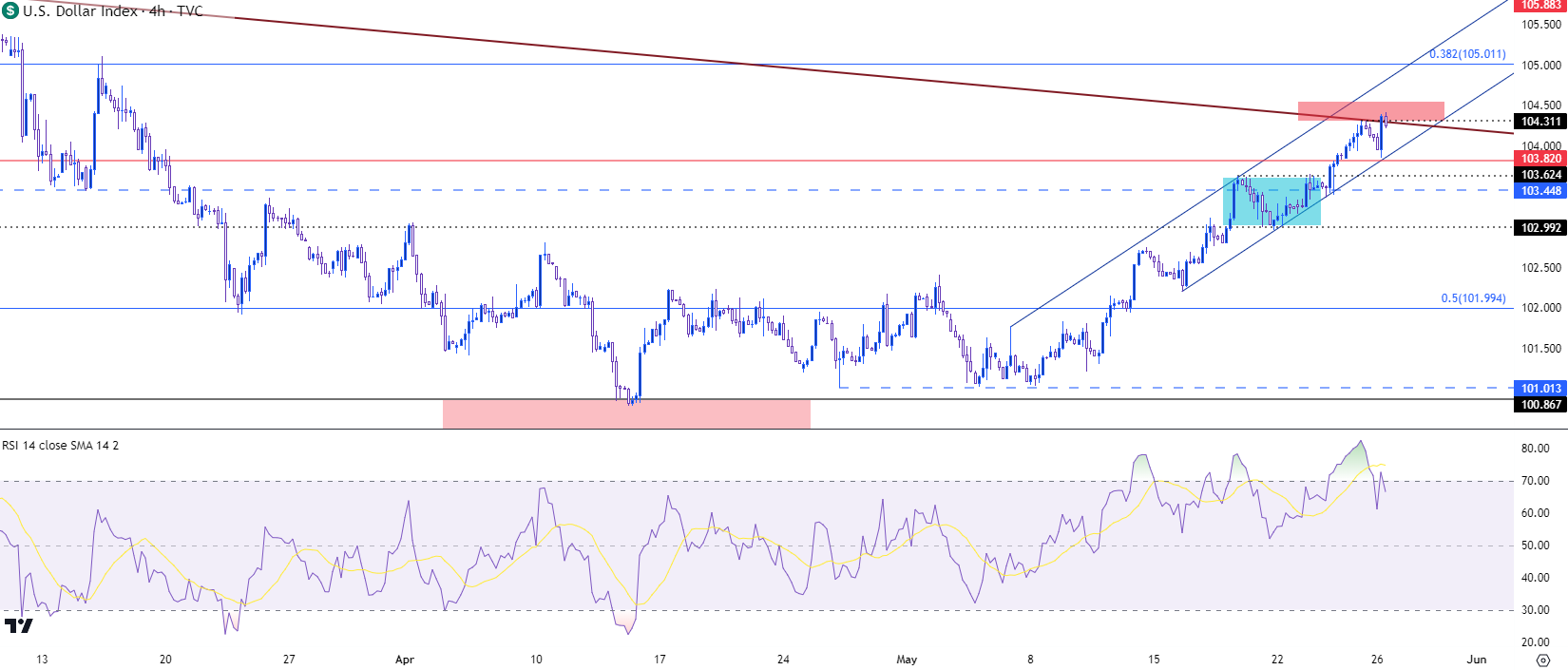 这个双底仍在发挥作用,但多头若要触发该形态,将需要在该形态的颈线上方进行测试,即我绘制的105.88。目前,由11月底和3月波段高点产生的看跌趋势线带来的阻力正在显现。在这个长周末之前,该趋势线在周五盘中发挥了作用,尽管日内曾触及该线之上,但多头并没有取得太大的进展。然而,这确实透露出看涨趋势中的回调可能性,我将在下一涨图表之后更深入地分析。
